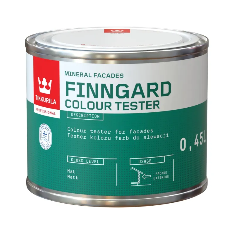 Wodorozcieńczalny, matowy, tester koloru farb elewacyjnych z rodziny Tikkurila Finngard. Po przeprowadzeniu testu powierzchnię należy pomalować farbą nawierzchniową.