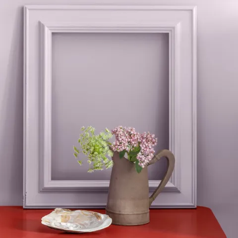 Tym odcieniem możesz pomalować całe pomieszczenie, a także meble lub podkreślić monochromatyczne ornamenty. J426 Lilac można połączyć z kontrastującymi kolorami mebli, np. L418 Nectar – aby uwydatnić element wystroju w stylu vintage, jak na zdjęciu poniżej.