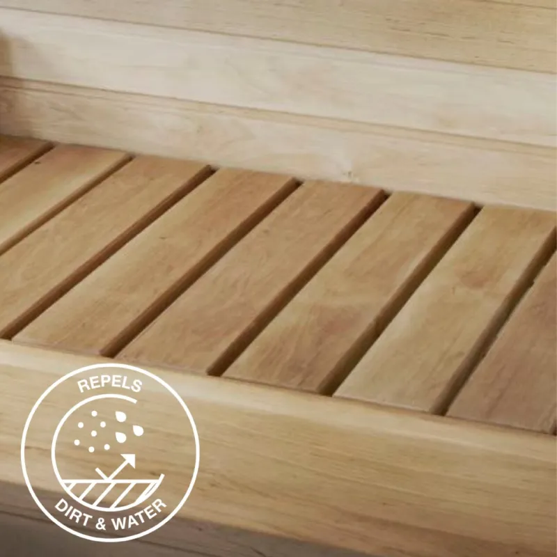 Produkt chroni drewniane elementy w saunie przed wilgocią i zabrudzeniami. Drewniana powierzchnia pozostaje czysta i przyjemna w dotyku.